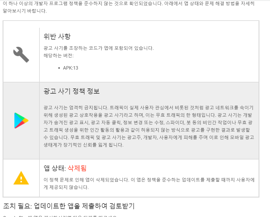 위와 같은 내용의 메일을 받아서 앱이 게시 삭제 되었었다.